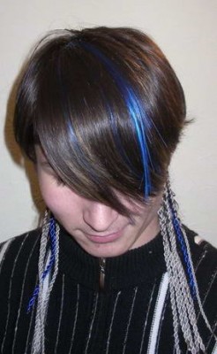 Наконец-то нашелся креативный человек который согласился на яркие цвета сенегальских косичек, у этой девушки эррокез, заплетено 120, косичек 8 оттенков, кроме этого использван материал ФЛЮР, который светится под УФ-лампой на дискотеке, фото не очень важное надеюсь позже вложу более лучшего качества...
