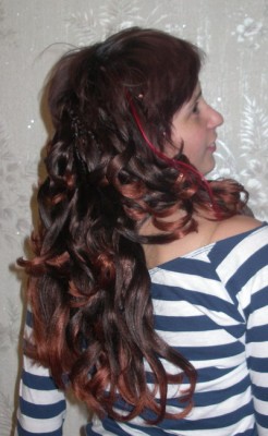 Сбоку нарощена прядь интенсивно красного цвета и розовые стразы на леске в дополнение...