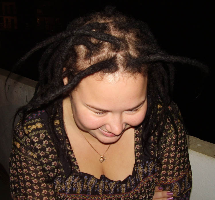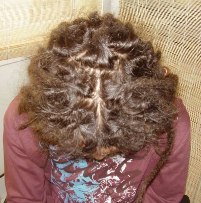 У нее волосы коричневого цвета, дреды покрасила в черный. Вот они немного отросли и получился такой эффект. + волосы негустые, дреды достаточно тонкие.
